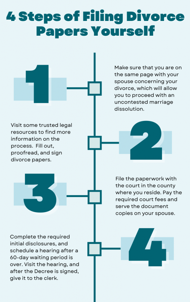 - File divorce online in Texas with the help of an online divorce provider. If you choose to work with a company like QuickDivorceTexas, you will not need to spend days looking for the paperwork or filling it out because you will get a full package of forms for only $159. Besides, you will save time and resources since you will be provided with a step-by-step filing guide. This way, you get everything you need for a marriage dissolution while putting minimal effort into the process.