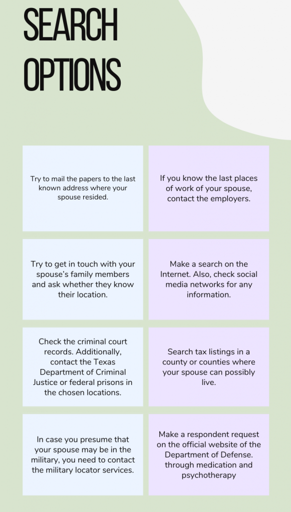 If you have searched for your spouse but got no results, the court may ask you to hire an attorney ad litem to look for them. Such an attorney will likely be appointed by the court, but you will also have to pay for their services. Attorney ad litem acts as an official representative of your spouse who has to do a diligent search for them and protect their right to know about the court case.